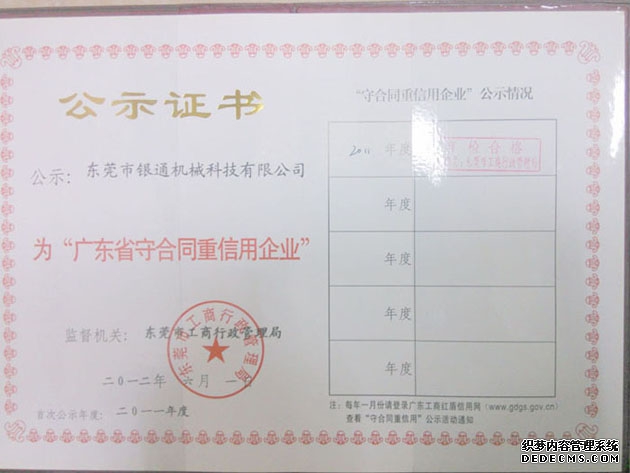 發(fā)布時間:2022-11-05T12:20:16更新時間:2022-11-05T12:20:16 瀏覽量:0近日,東莞市工商行政管理局授予我公司2011年度“廣東省守合同重信用企業(yè)”稱號,以表彰我公司在合同管理制度、合同履約能力以及企業(yè)社會信譽等方面所取得的卓越成績的辛勤努力。